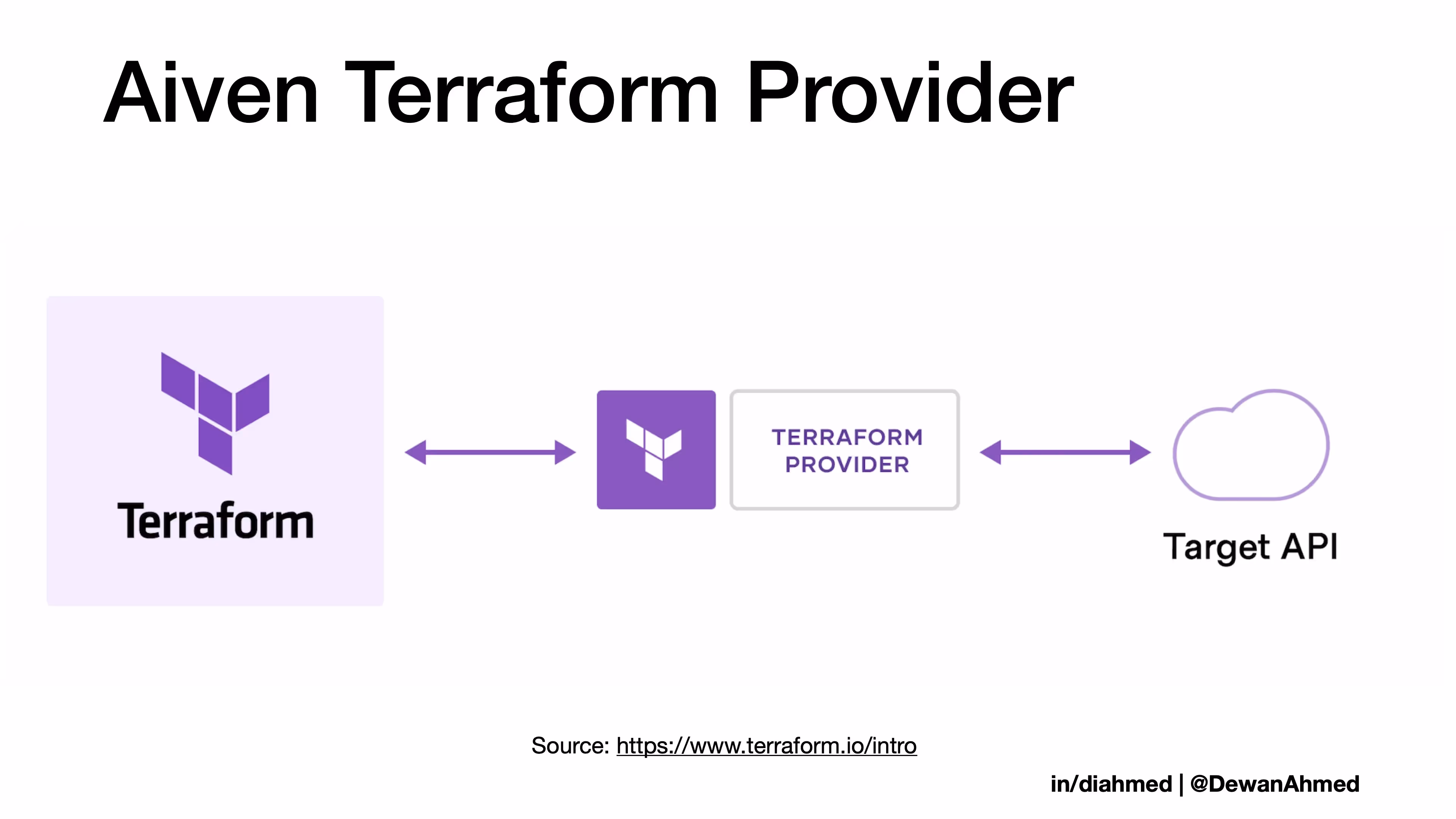 Terraform talks to any available target API via providers. For example, the Aiven Terraform Provider lets you create Aiven resources (Aiven for Apache Kafka®, Aiven for PostgreSQL®, and a number of other data-related services) on the cloud of your choice.