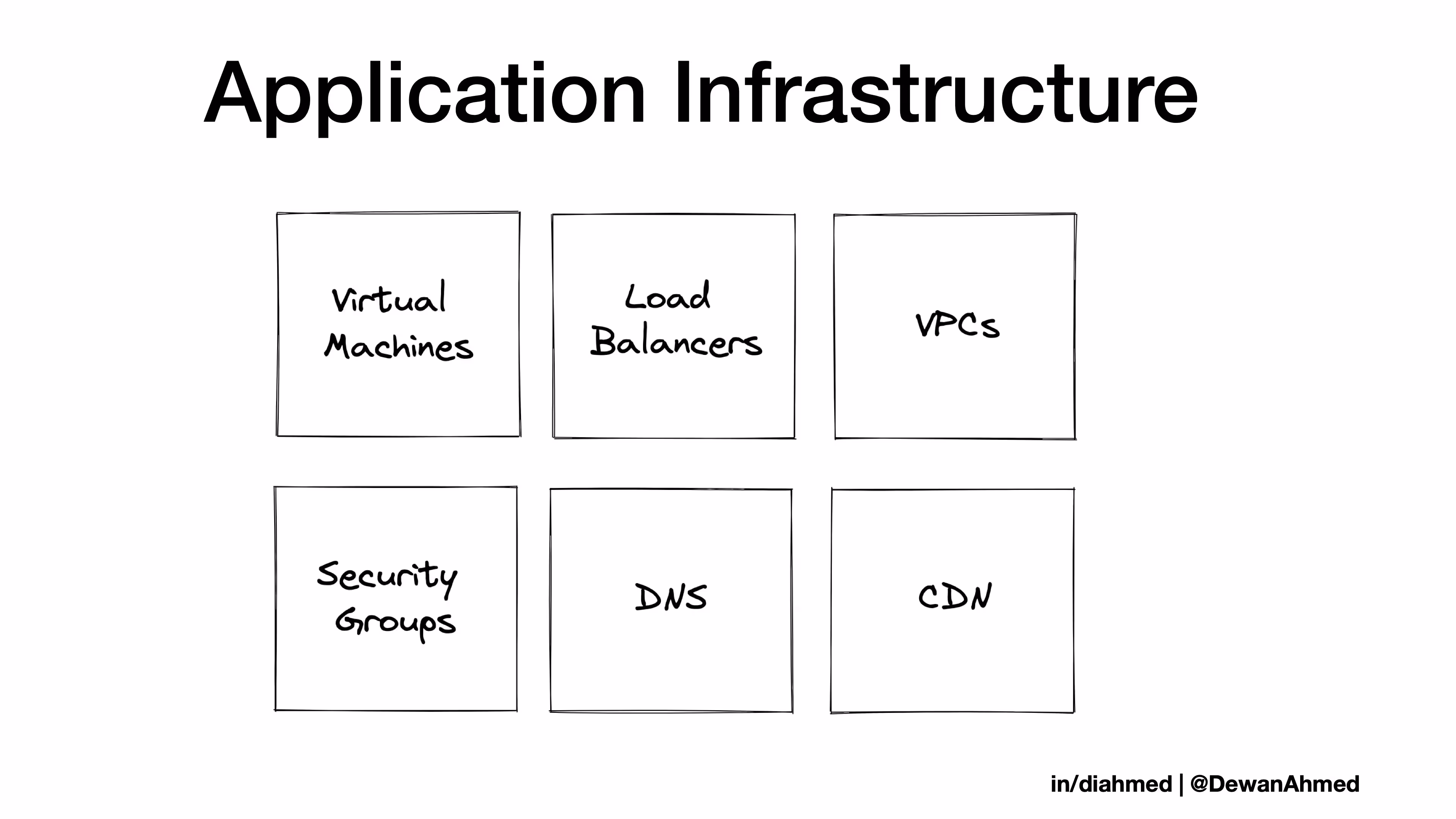When we talk about infrastructure, we are typically referring to the application infrastructure. Let’s say you start with your core network (VPCs) and add an abstraction layer on top of that for handling incoming/outgoing traffic (security groups). Then you build and run your virtual machines (VMs). You put a load balancer in front of the VMs, you point the DNS to the load balancer, and finally you might have a content delivery network (CDN) for faster delivery.