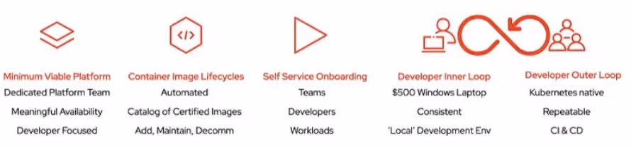 Iterative development: An iterative approach to providing an IDP that encapsulates the five container platform primitives allows platform engineering teams to begin small and iteratively increase and enhance capabilities provided by the platform to expand adoption.