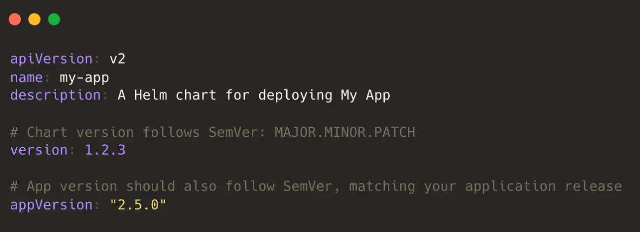 Stick to Semantic Versioning (SemVer) for both chart and application versions.This is a best practice that ensures predictability, repeatability, and traceability across deployments. Avoid ambiguous tags like latest to ensure repeatability and timely patching.