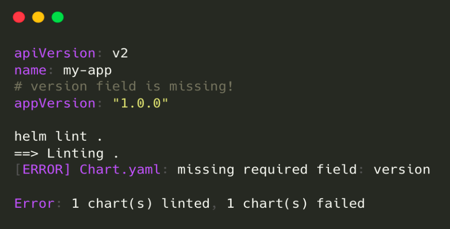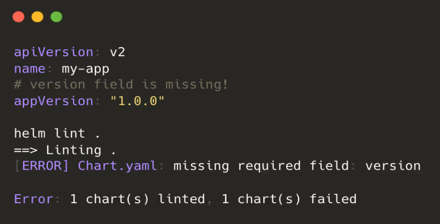 Use tools like helm lint to catch syntax and structural issues early.If it encounters issues that break with convention or recommendation, for example missing a ‘version’ field, it will emit an ERROR message.