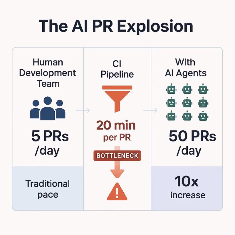 The math is brutal. Consider this recent question from Atulpriya Sharma: “If your current CI takes 20 minutes per PR, and AI agents submit 50 simultaneous PRs... that's 1000 minutes of queued work”. When working with large organisations, particularly those working in highly regulated environments, it’s not uncommon for the path-to-production to include several approval steps that take days or weeks to complete.