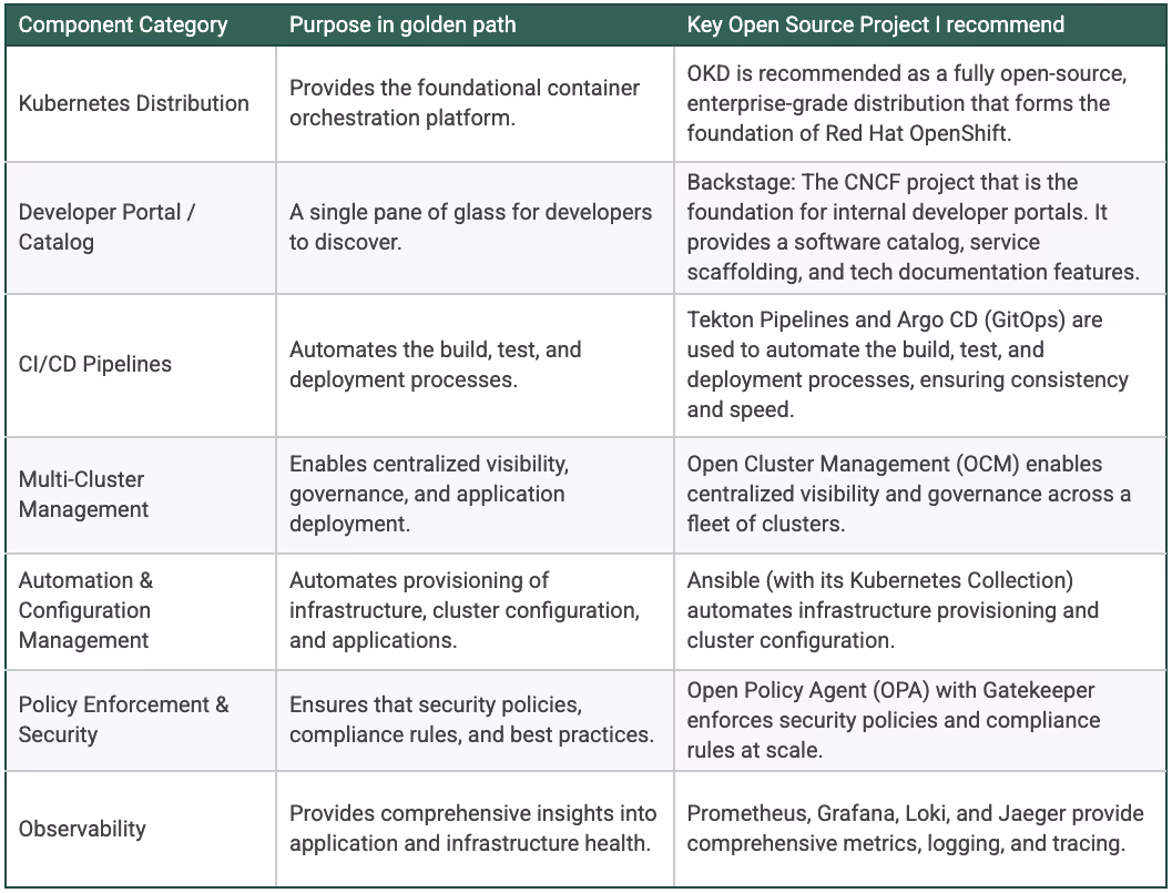 A robust golden path requires a specific set of open-source tools to ensure multi-cloud compatibility and avoid vendor lock-in.