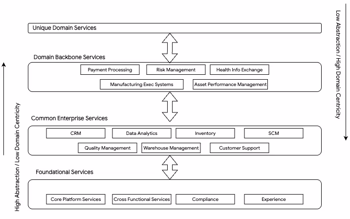 As illustrated in Figure 3, the concept of "abstraction shift" in Domain-Driven Platform Engineering (DDPE) represents the movement from highly abstract, generic platform services to domain-specific, business-aligned services. At the foundational level, platforms provide core, cross-functional, and compliance-related services that serve as the building blocks for broader enterprise applications. These foundational components exhibit high abstraction and low domain centricity, meaning they are designed to be broadly applicable across multiple domains but lack business specificity.