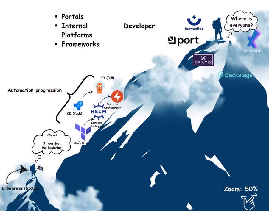 Taking shortcuts without evolving their tech stack or addressing low automation levels (still stuck between ClickOps and scripting) only made things worse. Instead of solving problems, companies ended up with a fancy portal and an unnecessary complexity layer. Maybe a nice UI, but little actual functionality.