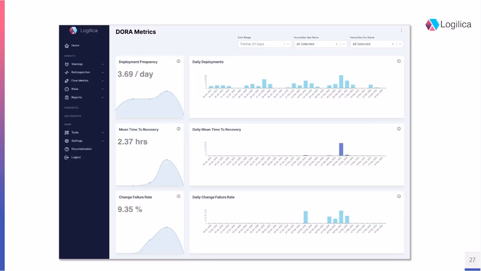 Nils, the lead QA engineer at Humanitec, explained how the Humanitec Internal Developer Platform (IDP) can be used in combination with Logilica to measure and aggregate DORA metrics: